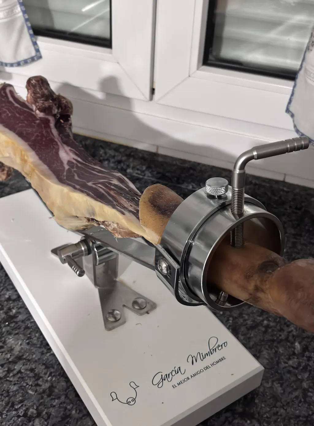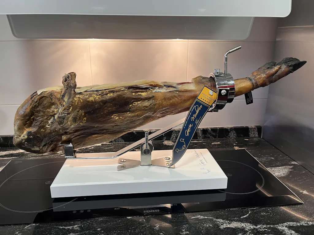 Me encanta, es súper práctico y bonito. El diseño es de 10. La base no es de fibra como pone en la descripción sino de madera-aglomerado lacado. Que no supone ningún problema porque es fantástico el jamonero